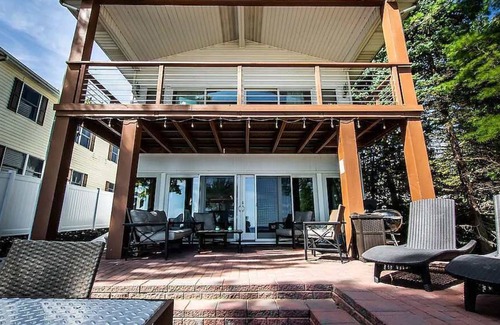 Located off the living room is a full paver patio with a BBQ! Outdoor furniture provides impressive and comfortable lunging for relaxing in the shade reading a book or just enjoying the view! The lower floor is handicap accessible with a ramp to the lower sunk in living room. The sunrise will wake you in the morning, coffee on the upper deck, and lake breeze keeps you comfortable throughout the day!