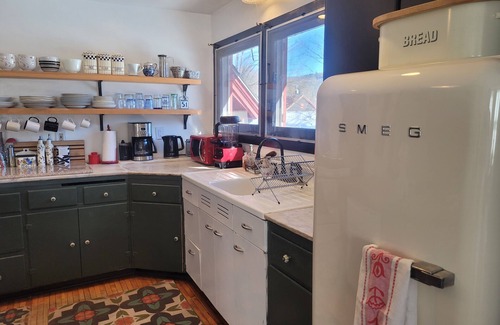 Be among the first to stay at this unique historical loft space, perfect for large families and only minutes from skiing! Perched above a quaint general store, the loft was originally a lively dance hall and theater. Updated with modern comforts that blend seamlessly with vintage details, it's truly one-of-kind. Located in close proximity to renowned skiing, fishing, and hiking spots, it's the perfect retreat for those seeking adventure or a tranquil getaway in the serene Catskill Mountains. The open-concept living area features exposed beams and original details, creating a warm and inviting atmosphere. The light-filled space is graced by large windows facing north, south, east, and west. A large kitchen island with stools and a dining table that extends to seat 8, invite everyone to gather around at meal time. Evenings are about relaxing by the fireplace, cozying up with a book in one of the 3 bedrooms, or treating yourself to a luxurious soak in the deep, claw foot bathtub after a day of hiking up or skiing down a mountain. Choose to have a classically trained private chef create gourmet meals that highlight the bounty of farm-fresh local ingredients (not included in rate). Tailored to your preferences and dietary needs, enjoy the luxury of delicious meals made with love without leaving the comfort of your retreat.