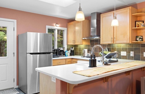 Located just four minutes away from Hawaii Volcanoes National Park on 1/2 acre of private forest, the Liko Lehua Cottage offers all the amenities needed for your home away from home. Enjoy the screened-in outside deck, surrounded by the Hapu'u ferns and other native trees and flowers. Wake up with a cup of coffee or tea, or unwind with a glass of wine, while listening to the birds or gazing at the stars. The rainforest is all around and can be enjoyed from the deck or through every window in the cottage.