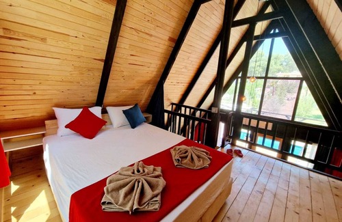 This A-Frame property is made entirely of natural wood and is one of only16 villas at the Benim Koy complex. The villa is well-equipped with a kitchen that is open plan to the lounge area. Free Wi-Fi, dishwasher, washing machine and TV are there to compliment your stay. There are two bedrooms - 1 x twin room on the ground floor and 1 x double room on the first floor, the bathroom is also on the ground floor.