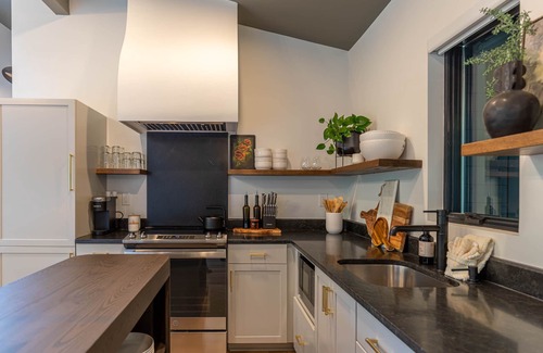 On the south side of the great room is the dining area with comfortable seating for all and forest views through the large windows. Adjacent to the dining area is the fully-equipped kitchen featuring a custom built island, stainless steel appliances, soft-closing cabinets and high quality silverware, knives, and cookware.