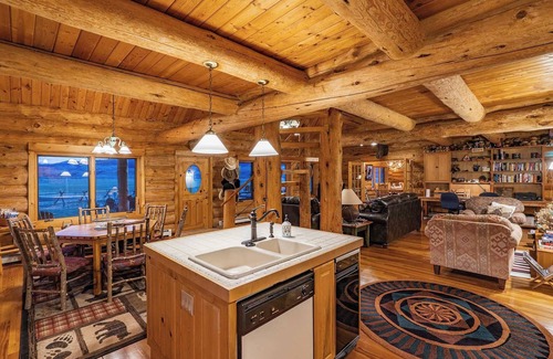 The den and entertainment area all share the southern amazing views. Our two story home has 3 king beds, two of them in master suites- one loft style, the other king in a ground floor guest room, 1 Queen bed in another ground floor guest room, and a full size sofa sleeper with spacious and charming accommodations for a total of 10. The decor is classic mountain Montana western