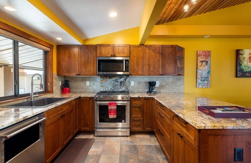 Kitchen and Living Room are on the second floor to provide a bright living space. The open concept kitchen is fully stocked with all the tools needed for your culinary creations. Cook with the five burner gas stove and enjoy a glass of wine, margarita, or martini - stemware provided. If grilling is more your style, it is on the deck off the living room. The gas fireplace provides a great place to read a book, watch TV (premium TV services included w/DVR & DVD) or check email. Heated floors in the kitchen and bathroom. In summer, we've got the right fan to keep you cool and the air moving. There is also a convenient half bath, laundry and pantry on the main floor.