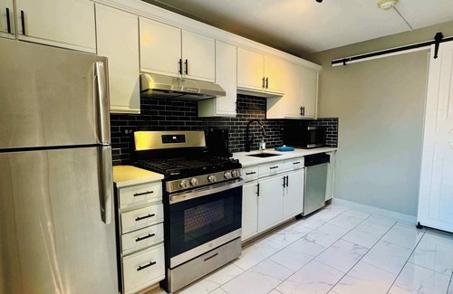 A full kitchen with bar stools, perfect for snacks, sips, or a post-night-out breakfast