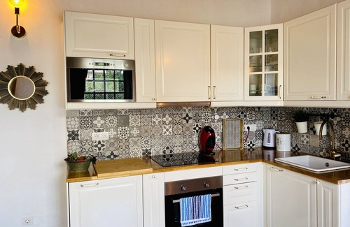 This 1-bedroom, 1-bathroom rental features a living room, a dining area, and air conditioning. Bathroom amenities include a hair dryer, towels, and toilet paper. The kitchen is equipped with an oven, a stovetop, and a refrigerator, as well as a coffee maker, an electric kettle, and a microwave.