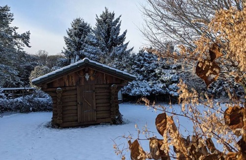 Log cabin sauna house in the garden, fireplace, large fenced garden, near the Kiel Canal, peace, nature, children, dogs welcome. .. WiFi. Isolated location.