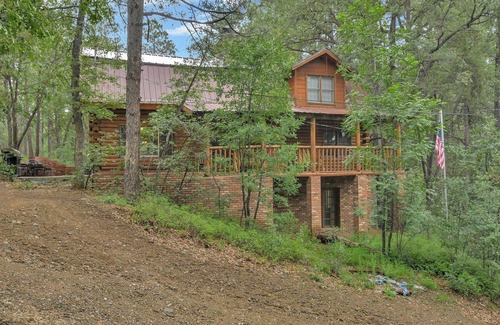 Pine Trees, acreage, National Forest and comfort. This is a large log and brick home in the Prescott National Forest. Invite your friends!! This is a big place. The cabin is located less than 8 miles from downtown Prescott, AZ. The 5400+ sq feet of living area lends itself well to large groups and multiple families. The cabin is located in the Prescott National Forest and there is 2.5 miles of uphill dirt road to access the cabin. You WILL NEED FOUR wheel drive and possibly chains during the winter months in case of snow and ice. This cabin is cozy, unique and its setting is beautiful. There are 2 master suites with ensuite baths and 2 additional bedrooms. The bunkroom sleeps 6 on bunk beds with lower futon mattresses that are great for kids or a family who has multiple young children that want to sleep in the same room. There is also an additional bedroom with a queen bed. The large living areas include large couches and lots of floor space for additional sleeping. The property is on 4 secluded acres. This is a fantastic place to be enjoyed for family getaways, reunions or corporate functions. This cabin is in the forest and is not ideal for those looking for a 5 star resort, paved roads or concierge service. If it's a cabin experience your looking for we are confident you will enjoy your stay and return often.