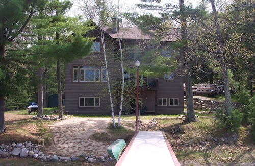 Enjoy this lodge lake style retreat cottage. Available for Saturday to Saturday rental only. Full recreational lake. This home has 4 bedrooms, 4 queen size beds, plus 7 single beds in open loft and other sleeping areas. Nice couches and pit group. Kitchen includes double dishwashers and convection ovens/warming drawer, induction cook-top, fridge in kitchen and old school fridge in the walk out basement with ping pong. Kitchen is fully stocked with plates pots/pans and what you need to make great meals. You provide your own bedding. 3.5 baths with great showers and great water inside the house and great clean/clear lake water for the kids in the lake. Facilities include a tub and handicap shower with sitting bench. Home has a very open floor plan that is conducive for walker and wheelchair use. A row boat is provided to explore the beautiful nearly 500 acre lake which has great Nicolet Forest land on its shores. An assortment of wild life can be seen that include deer, loons and bald eagles. Enjoy the fishing and this is a full recreation lake. Loggers-pointe is the tip of a point and is over 200 feet of beach front and only 50ft to walk from door to beach! The Kitchen and great room has panoramic views. Straight view across the lake to the eagles nest and the islands. Campfire pit and firewood near the shore. One big pier with patio set and another for your boats. Geo-Thermal Heating and Cooling for comfortable sleeping and allergy control year round. This isn't exactly roughing it!