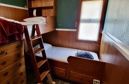 The Bunk Room has two twin bunk beds, sleeps two, and has plenty of space to store your belongings during your stay— including any reading materials you may have brought along to read during your time at the beach.