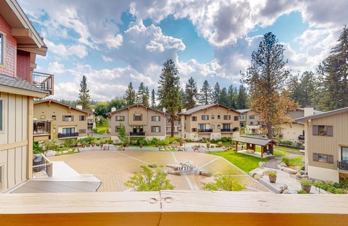 This townhome sits on the (elevator-accessible) third floor of Alpine Village, offering views of the surrounding evergreen treetops and a courtyard and fountain below. It's a scene best enjoyed on your private balcony, where you can sip your morning coffee in a rocking chair, barbecue on the gas grill in summer, and relax with a glass of wine at night.