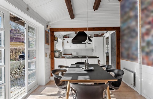 Your charming house combines Scandinavian clarity with the flair of traditional Danish summer houses. The light-flooded living area with exposed wooden beams on the ceiling and views of the countryside creates a cosy, feel-good environment. Delicious meals can be prepared in the modern kitchen and then enjoyed in a relaxed atmosphere at the dining table. In the evening, the wood-burning stove provides cosy warmth, ideal for cosy reading sessions or a glass of wine on the sofa. You can relax in the hotel's own sauna.