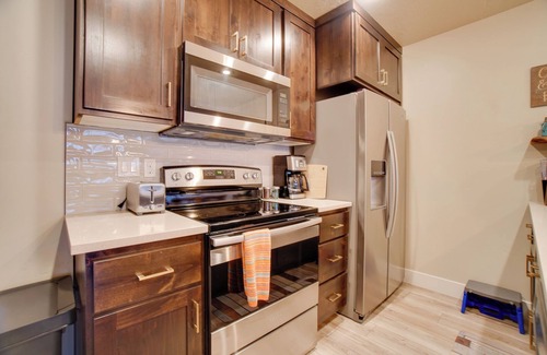 KITCHEN: Breakfast bar w/ seating, dishwasher, refrigerator, stove/oven, microwave, Keurig, drip coffee maker, toaster, blender, cooking basics, dishware & flatware