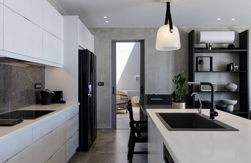 Kumo Villa I is a ground floor property, covering 110 m2 and able to accommodate up to 5 guests in its two en-suite bedrooms. The south-facing facade is made of floor-to-ceiling glass panels, blurring the boundaries between the inside and the outside, by wrapping the interior in panoramas of blue sea, sky and the horizon. Branded, quality furniture and decor (Flos, Baxter), as well as the industrial-inspired palette (with black, white and grey colours) create a beautiful living space capped by sweeping views across the landscape.