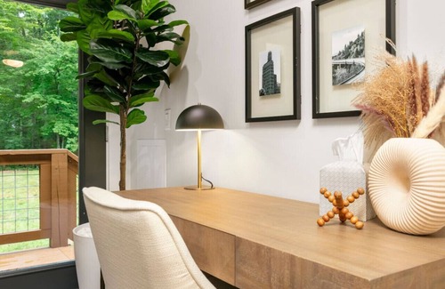 Just two miles from downtown Asheville yet tucked into almost an acre of woodland, Nanas Branch blends upscale design with the rustic beauty of the Blue Ridge Mountains. Start your morning with coffee on a forest‑view deck and end your evening soaking in a six‑person hot tub under twinkle lights and stars. Professionally designed interiors feature new furnishings, a gourmet kitchen with granite counters and high‑end appliances, and a living room with vaulted ceilings, stone fireplace and 4K smart TV. Outside, multiple fireplaces, a BBQ grill and a fire pit invite you to gather amid the trees while still being close to Asheville’s dining and nightlife.