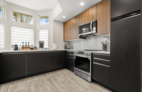 The dining area seats 6 people, and the modern kitchen is stocked for real cooking. Kitchen includes: pots/pans, basic spices, oil, coffee/tea, coffee maker, kettle, blender, toaster, microwave, dishwasher, and BBQ tools for the grill outside.