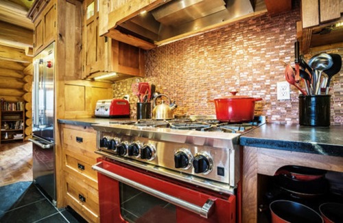 Strong natural light floods the interior, with cathedral-style ceilings and exposed beams creating an inviting space to gather in the great room. Comfortable seating, a smart TV, and a toasty wood stove provide the centerpiece for casual downtime. The impressive chef's kitchen is equipped to inspire gourmet creations with appliances including a Blue Star-brand six-burner range with a custom-log island and heated flooring. Additional perks include a 14-set boot and glove dryer for convenient winter gear storage.