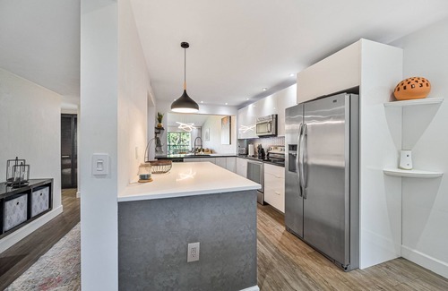 The remodeled kitchen with breakfast nook is fully equipped - please contact us directly for our minimum inventory list. The primary suite features a king bed and bathroom with walk-in shower. A shower/tub combo in the guest bathroom.