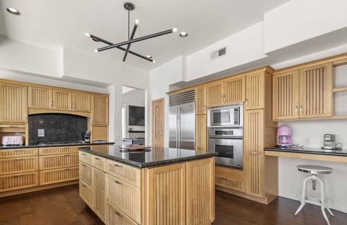 The expansive kitchen is a chef's dream, boasting granite countertops, an island for convenient meal preparation, and a range of modern appliances. With two pull-out pantries, a traditional pantry, a six-burner stove, an ultra-quiet dishwasher, and a convection/microwave combo, every culinary need is met. The tri-fold door seamlessly connects the kitchen to the pool area, creating a seamless indoor-outdoor living experience.