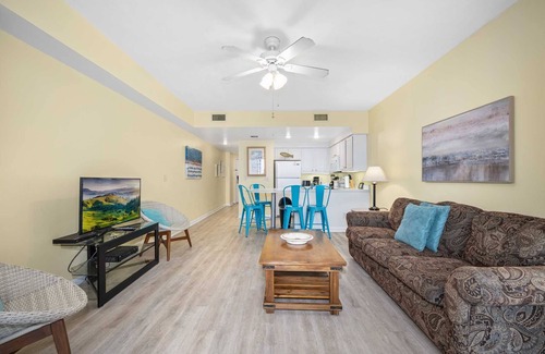Beautiful condo includes new flooring, a full kitchen, two new flat screen TV's, washer/dryer, free high-speed Wi-Fi, and more! Fully furnished with two full sized beds in a large private bedroom with a bonus queen sofa sleeper in the living room. The private oceanfront balcony provides spectacular views of the beach, pools, band shell and pier.