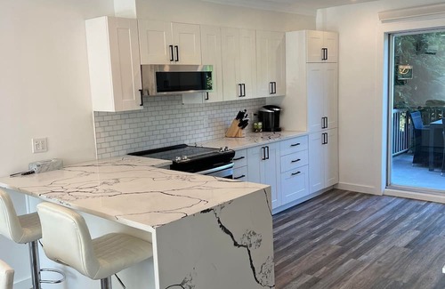 Welcome to our modern 2-bedroom retreat, where stylish living meets comfort. The bedrooms, though not cloud-like, are adorned with contemporary vibes for a cozy stay. The living room steals the show with a cloud-like couch and a 65-inch smart TV offering free content on Apollo TV. The kitchen adds a touch of cool to cooking, making it a hub for family or two couples to gather. And let's not forget the amazing bathroom—a sleek oasis of bliss. Top it off with a spacious backyard, and you've got the perfect spot for a laid-back stay!