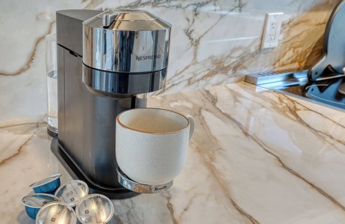 The cozy living room centers around a beautiful fireplace and is outfitted with a large sectional, accent chairs, and a flat-screen Smart TV with a Sonos Sound Bar. A second Smart TV is available in the master suite.
