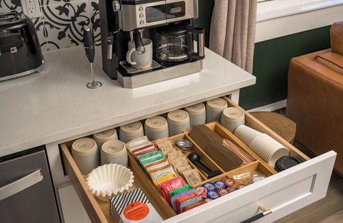 The downstairs family room serves as your ultimate hangout space, complete with a large TV for movie nights, a gaming table for friendly competition, and a convenient get-ready station. Whether you’re lounging, playing, or preparing for a night out, this space has you covered.