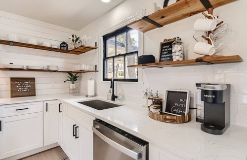 The kitchen features a large marble waterfall island with seating for 8, so it functions as a dining table (or a good place to play some games - we have provided a bunch of board games and cards if you're into that!). It is also fully stocked with cooking supplies, utensils, and some pantry staples. Check our amenities for a full list of what is available. We also offer a full coffee bar, stocked with K-Cups for the Keurig or some ground coffee to use our coffee pot, various sweeteners, syrups, and creamers - because coffee is my love language! For the non-coffee drinkers, we've got various flavors of tea as well.