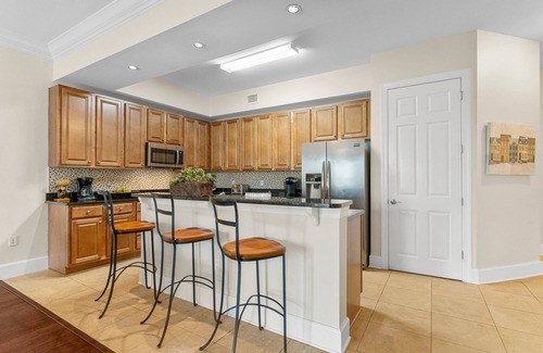 This incredible unit features 10 foot ceilings, granite kitchen & bar counter-tops, updated kitchen appliances, wireless internet and a gas fireplace. The living room/ dining room and all three bedrooms have new hardwood floors. All bedrooms have their own private bathrooms, ceiling fans, cable boxes, HDTVs and DVR. The master bath has a large jet tub & separate marble walled shower. The living room has two ceiling fans and a new 55” adjustable flat screen smart HDTV w/cable box, DVD & a Blu-Ray player. The kitchen is fully furnished including small appliances such as a toaster, toaster oven, a blender & 2 coffee makers (drip style & Keurig unit). The cable network has the sports package and a DVR (recordable programing) package for the living room & master bedroom.