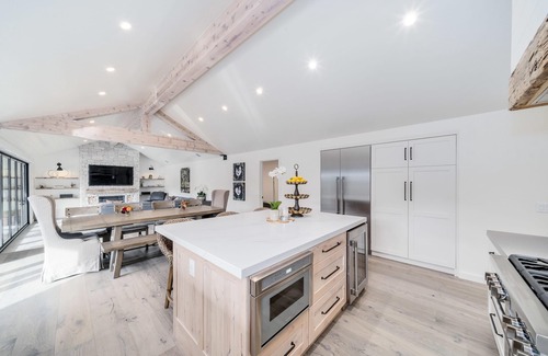 Every corner of this estate exudes elegance and sophistication, with unique touches such as wood shelves and a fireplace mantle reclaimed from a historic sailing vessel in Bodega Bay, and a stone fireplace crafted from stone sourced from a 200-year-old quarry in Vermont. The main house features a vaulted great room, a chef’s kitchen with stainless steel Thermador appliances, and three separate bedrooms, including two large ensuites and an oversized third bedroom. Additional amenities include an office with a queen day bed and trundle, perfect for children or a relaxing afternoon nap.