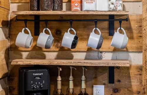 GOURMET COFFEE BAR includes dark French roast, medium breakfast roast, and decaf whole beans, Cuisinart drip coffee maker, french press, bean grinder, creamer, sugar, Torani syrups, hot chocolate, and tea.