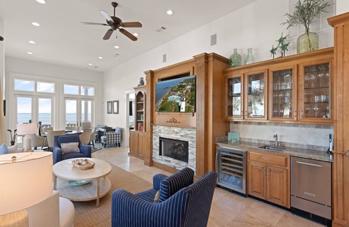 The beach access is just a few steps from the home's entrance. Although this home is ocean front, please note that the public beach access can be tide dependent. High tide occurs twice over a 24 hour period. During those times, you can enjoy the private deck or sandy play area in front of the home and keep the sunbathing going, or slip inside to get ready for a night out.