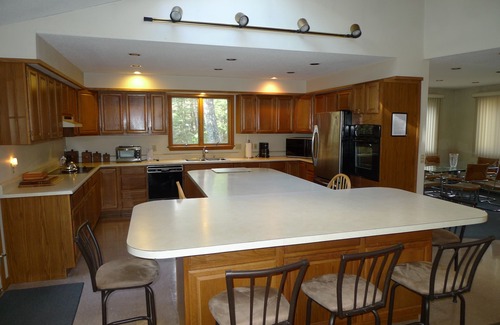House is modern with over 3000 sq ft of living space. Upper level has 20x28 fireplaced living area with 15 ft. high cathedral ceiling , large top-of-line applianced and fully equipped kitchen with 40 ft. of oak cabinetry and 8ft X 12 ft T-shaped breakfast bar that seats 8. Has separate dining area w/ glass table that seats 6-8. and full bath. Large Anderson casement windows (with custom vertical blinds) and 3 skylights create an open/airy atmosphere during day, and track lighting and dimmers provide interesting evening lighting options. Living room opens onto fully carpeted and screened 11x30 screened and carpeted deck, and open deck with lakeview for sunning. Lower level has knotty pine entrance room, second full bath, and 4 tastefully furnished bedrooms with large closets and ceiling fans. Basement has clothes washer and dryer and extra set of bunks Fully equipped, just bring linens. Fully winterized w/ circulated hot water by oil.