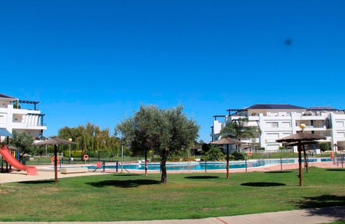 The apartment is in the "Bahía Golf" urbanization. The new and wide urbanization with large garden areas. This space between houses and large green areas to enjoy the pools or to simply enjoy the outdoors, is what makes it special. It also has paddle courts and 2 swimming pools (for adults and one for children). The urbanization is surrounded by golf. The beach is right next door (5 minutes) and is huge, it's great.