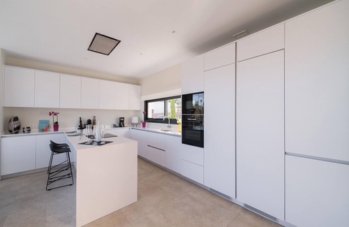 Layout: Ground floor: (open kitchen(electric kettle, espresso machine, combination microwave, dishwasher, fridge-freezer), Living/diningroom(TV, dining table, seating area), bedroom(double bed), bedroom(double bed), bedroom(single bed, single bed), bathroom(shower, washbasin, toilet), bathroom(shower, washbasin, toilet), hall) Basement: (bedroom(double bed, TV), bathroom(shower, washbasin, toilet), garage, terrace, bicycle storage) air conditioning, terrace, roof terrace, garden furniture, sun loungers, BBQ, parking, parasol, swimming pool(private, outside, heated), lounge set