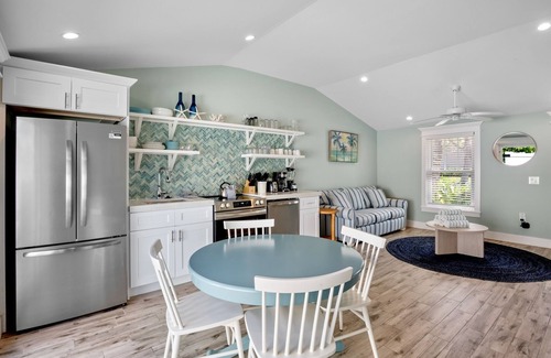 Inside, a bright coastal interior with a modern open layout. The fully equipped kitchen includes stainless steel appliances, cookware essentials, and a chic dining table for four. The inviting living room offers a plush sleeper sofa, TV, and sliding glass doors that open directly to the shared pool deck for seamless indoor-outdoor living.