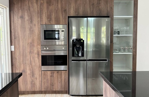 The kitchen is full of amenities such as a combi oven, dishwasher and an american fridge with water and ice dispenser. The villa also has a washing room for washing and drying clothes.
