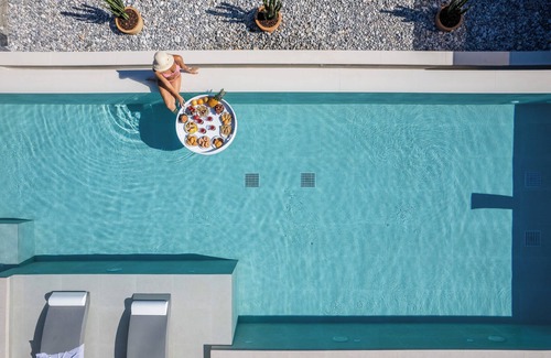 - A private, 56 sq.m. swimming pool, adorned with a graceful waterfall and two in-pool chaise longues. With a depth of 1.4 meters, the pool features a dedicated hydromassage enclave and a shallow area for younger guests 0,50m deep.