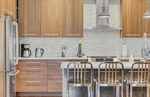 You will enjoy cooking in this spacious kitchen with gorgeous stainless steel appliances and an oversized island with sitting space for 6. Adjacent to the kitchen is a dining table for 8 and a gorgeous high-ceiling lounge area with a fireplace, a big sofa, and a 60` HDTV.