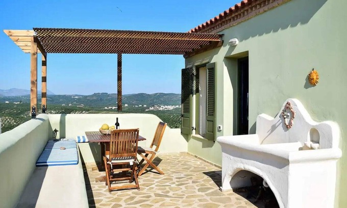 Ascend the stone staircase to discover a spacious terrace boasting breathtaking vistas of verdant hills, snow-capped mountains, and sea views stretching from the Stavros peninsula to the Kolimvari gulf. Relax and dine al fresco on the expansive terrace, complete with a traditional wash basin, a large wooden table and chairs, and stone built sitting benches where you can sip local wine and soak in the scenery.