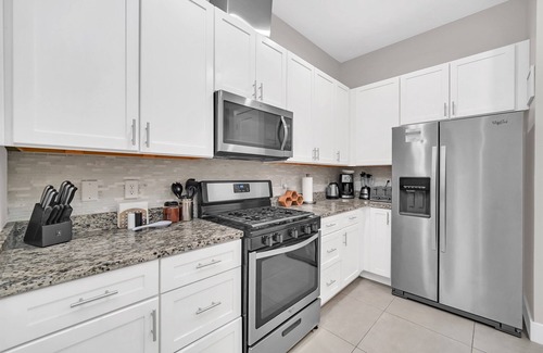 Once you enter the magical residence, you will be greeted by an open floor concept that brings together the kitchen, dining and living areas. It is the perfect spot to gather, talk, laugh and entertain. The fully equipped kitchen is updated with granite counters, stainless steel appliances, and waterfall granite island with bar-stool seating for four. The dining area features a contemporary table that seats eight and the living room is decorated in a modern and elegant style. You can also just relax and watch your favorite movie on the smart tv.