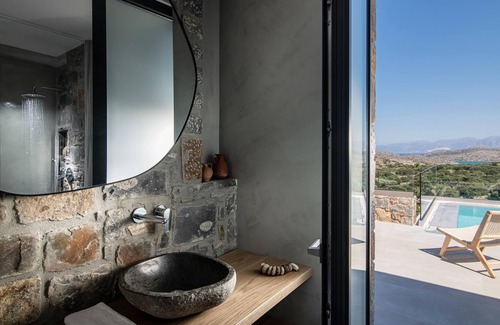Majestic stone and modern architecture villas with unique views to Spinalonga Island and the Aegean Sea, opulent interiors and private pool/BBQ.