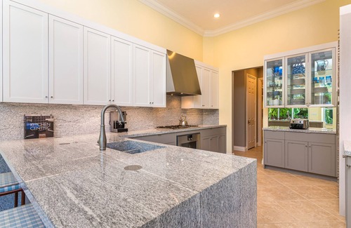 This three bedroom, three and a half bath house is newly decorated with custom furniture and designer fabrics. The master bedroom is spacious, with walk-in closet and luxurious bathroom with separate shower enclosure and large jacuzzi tub. A second bedroom features a queen bed, Ultra HD television, walk-in closet and ensuite bathroom. The third bedroom has twin extra-long beds and adjoining cabana bathroom. Each bedroom, the family room and separate office has a ceiling fan even though the house has central heat and air conditioninng.