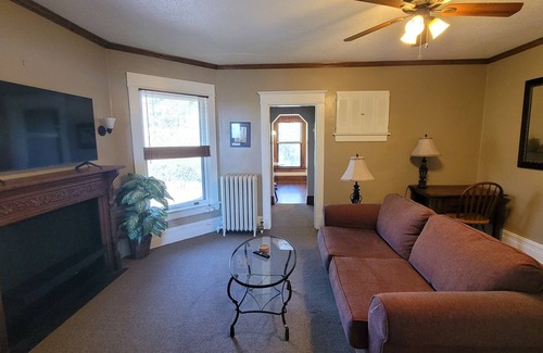 Stay at this historic colonial apartment in the heart of Duluth. The living room has great space for you and your guests to hangout and spend time together. The kitchen is fully stocke with your basic essentials and has great counter and cabinet space for all your cooking needs! Whether you're enjoying a book in the bedrooms reading nook or a cup of joe on the balcony you're going to have a great stay! On site laundry, off-street parking, private entrance, WIFI, and a 4K TV!