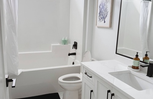 The private bathroom features sleek black fixtures, a full tub and shower combo and fresh towels.
