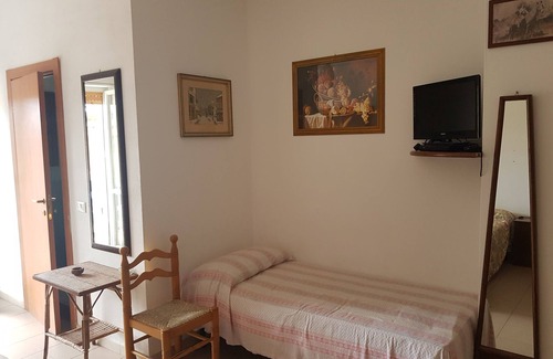 The "Marina" is situated on the second floor of a 5 floors building provided with porter, elevator, free parking outside the resort, wi fi, inside La Pineta albergo hotel resort. The 'Marina' is the ideal place for 2 - 3 adults, or one couple with 1 or 2 children, who want to spend their holidays in a relaxing and quite place very close to the sandy beach (5 min. walk) and the town centre,(10 minutes walk). The apartment is composed by a large room with 1 double bed + 2 single beds, tv, wi-fi, equipped kitchenette with oven and toaster, indipendent bathroom with cabin shower, terrace with table and chairs where you can eat and relax. Upon arrival we provide our guests with the town centre map (including information of the streets, shops, restaurants, tour agencies, and more. Check direct flights to LAMEZIA airport, then 50 minutes local train trip to Tropea station. From Tropea train station is 20 min walk down to the accommodation. Taxi transfer from Lamezia airport upon demand.' After your reservation we need to know how you get here: plane, train, car; the arrival times and your mobile contact, we ll give you our contact in order you need help during your trip.