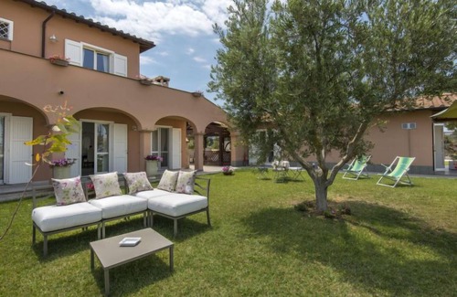 Villa "Marina Velca", 20 m a.s.l detached. 7 km from the centre of Tarquinia, 28 m from the centre of Tuscania, 37 km from the centre of Capalbio, 2.5 km from the sea, in the countryside. Private: garden 600 m2 (fenced), swimming pool (12 x 6 m, depth 150 cm, seasonal availability: 01.May. - 30.Oct.). Outdoor shower, garden furniture, barbecue. In the house: heating to be paid on the spot, heating available only from 01.Nov. - 07.Apr bicycles available (extra). Motor access to the house (50 m via unmade road). Parking on the premises. Supermarket 16.5 km, restaurant 3.8 km, bus stop 4 km, railway station "Tarquinia" 3.8 km, sandy beach 2.5 km. Golf course (18 hole) 500 m. Nearby attractions: Civitavecchia 23 km, Pescia Romana 27 km, Leopoli Cencelle 27 km, Viterbo 50 km. The owner does not accept any youth groups. The structure advertised by us consists of the main body that houses up to twenty-two people and an apartment for two people, always inside the structure, equipped with a kitchenette.