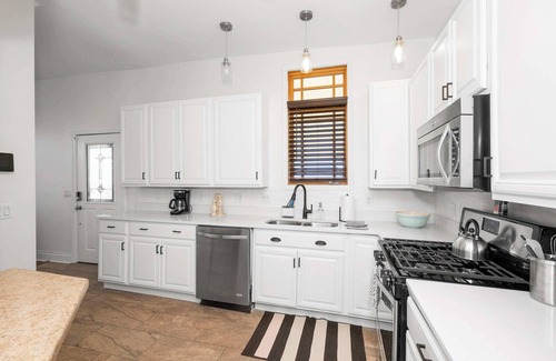 Inside the home, open and updated spaces are illuminated in natural light, creating an atmosphere conducive to both relaxation and togetherness. Curl up in the living room on plush sofa seating while you stream episodes of your favorites shows on the smart TV. A table for 2 is perfect for crafts and a game of cards, or perhaps even a light snack as you enjoy the view out past the sliding doors. To whip up delicious homecooked meals, head into the well-equipped kitchen showcasing stainless steel appliances, stone countertops, and sleek cabinetry stocked with cookware and dining ware. Enjoy your bites bar-style at the counter with high-top stool seating for 3.