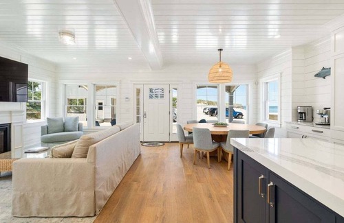 The main level features a gourmet kitchen with top-of-the-line appliances and a large center island, perfect for gathering and entertaining. The open-concept layout flows into a stylish living room and dining area, filled with natural light and thoughtfully curated coastal décor. Also on this floor is a comfortable queen bedroom and a full bathroom, ideal for guests seeking easy access.