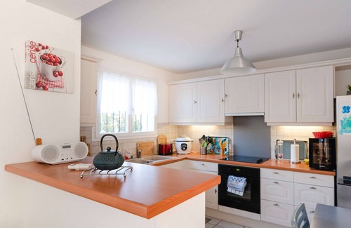 The cosy living/dining area has a comfortable corner sofa, flat screen TV, table with chairs, access to the fully equipped open kitchen (ceramic hob with hood, coffee maker, kettle, toaster, oven, fridge with freezer compartment, dishwasher...). A guest toilet is located on the ground floor, as well as the garage (used for storage and laundry), with washing machine, additional fridge top, microwave, sink, beach games, folding baby bed, high chair, electric grill...).
