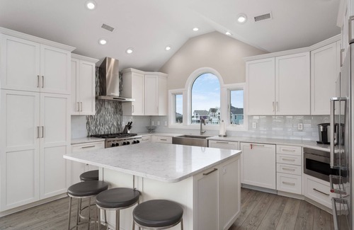 After a day of sun, sand and surf, come home and unwind in the thoughtfully designed and tastefully furnished great room. The reverse floorplan, vaulted ceilings and wall of east-facing windows make the most of the horizon ocean views. Chill your bottles in the wine fridge before curling up in front of the cozy electric fireplace. Both the living and dining areas lead out to a spacious sun deck with barefoot-friendly Trex decking. Back inside, the open-concept layout and stylish LVP flooring tie the common areas together for a cohesive look with excellent flow. The chef in your group will appreciate the remodeled gourmet kitchen with large center island, quartz countertops and top-of-the-line appliances including a six-burner gas range. Two refrigerators and two dishwashers make cooking and clean-up for large groups a breeze. The primary suite is also located on the top level and features a spa-like bath with dual vanities and custom tiled shower with rainfall showerhead. The mid-level consists of a den with TV and four additional bedrooms - all ensuite for plenty of privacy. Downstairs you'll find two more bedrooms, as well as a rec room with pool table and convenient access to the backyard oasis where you can cool off in the saltwater pool or soak in the hot tub. After dark, gather your family and friends around the fire pit to share stories, tell jokes and make memories under the stars.
